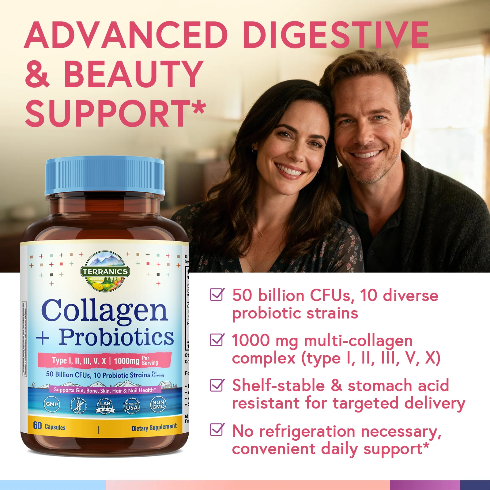 - Comprehensive 5-Type Collagen Complex: Terranics Collagen + Probiotics delivers 1000 mg of hydrolyzed collagen from bovine, chicken, marine, and eggshell membrane sources. This multi-source blend provides collagen types I, II, III, V, and X, offering comprehensive support for healthy skin, hair, nails, and connective tissues.*